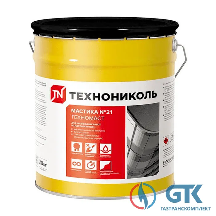 Мастика ТехноНИКОЛЬ № 21 (Техномаст) представляет собой полностью готовое к применению защитное решение, получающее высокую востребованность при производстве гидроизоляционных работ на объектах различного назначения. Состоит из четко выверенной комбинации компонентов - нефтяного битума с искусственным каучуком, мелкофракционными минеральными наполнителями и органического растворителя, придающего раствору удобную консистенцию.