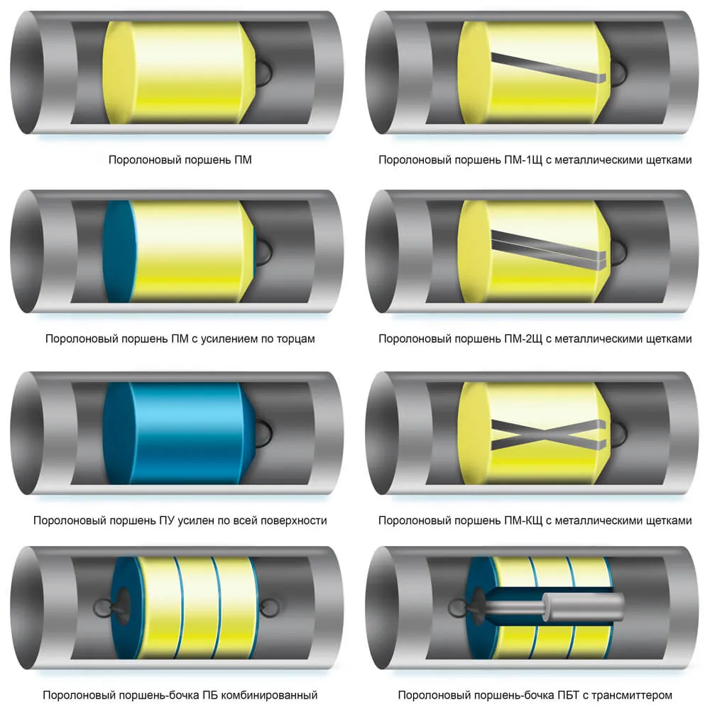Специальные поролоновые поршни ПУ, упрочненные по всей поверхности полиуретаном, плотностью от 40 до 200 кг/м3 применяются для очищения внутренней стороны магистральных и производственных труб от асфальто–смоляных, грязе–восковых и иных загрязнений, а также для устранения продукта из внутреннего пространства трубы. Обладают способностью преодолевать геометрические недостатки трубопровода, достигающие до 45% от Dn, и 90–градусные повороты с радиусом изгиба 1,5 Dy и больше.